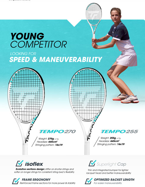 Kolekcija ženskih loparjev Tecnifibre Tempo je bila ustvarjena, da igralkam zagotovi največjo moč, manevrirnost in dovolj spina.