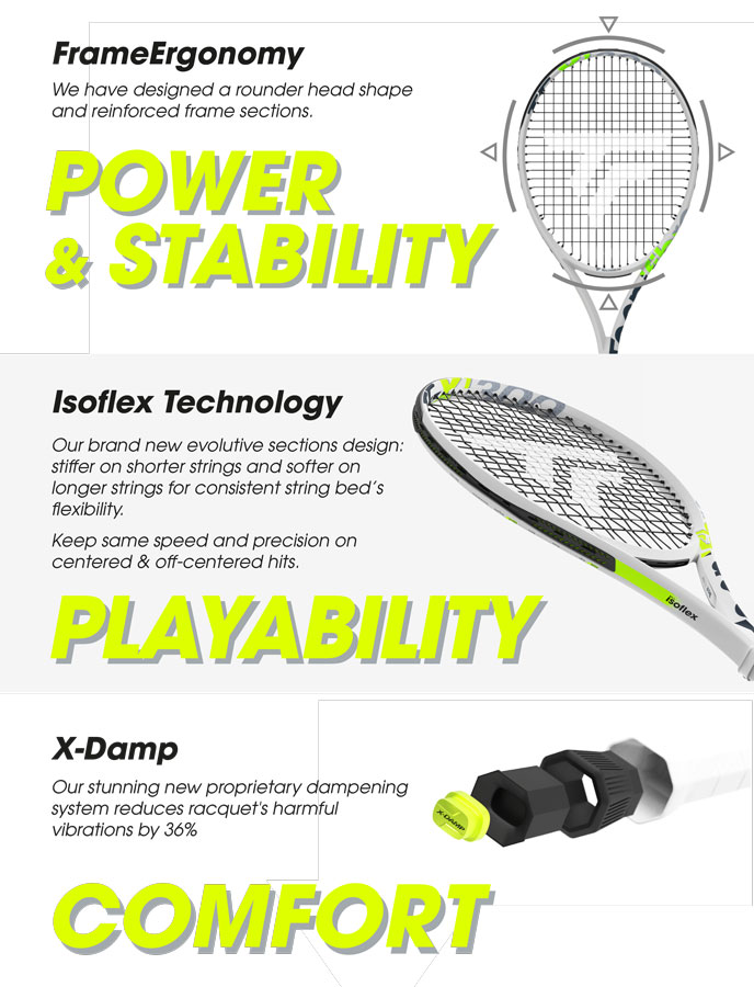 X-Damp: je nova tehnologija blaženja, ki so jo razvili že za loparje Lacoste. Tehnologijo je prvotno razvil Rene Lacoste, Tecnifibre pa jo je samo še izpopolnil. Na takšen način so zmanjšali vibracije za 36%, kar poveča udobje, zmanjša utrujenost in izboljša igralne lastnosti.