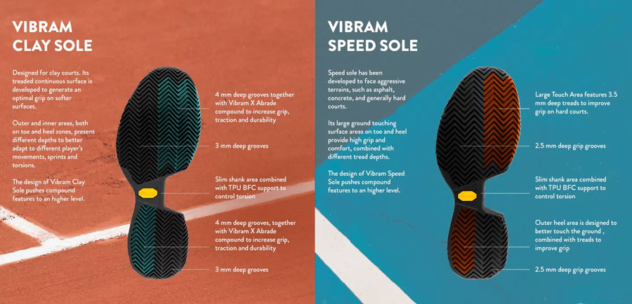 Clay za vse peščene podlage in Speed Sole za trde podlage. V dvoranah je močno odvisno od tega, kakšno podlago uporabljajo.